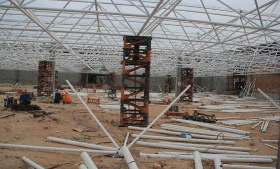 5)总体晋职法:此步履多使用在周边支护以及有多点支护的网架结构,可采取平板升降机、液压千斤顶等小型机具作业江西施工;